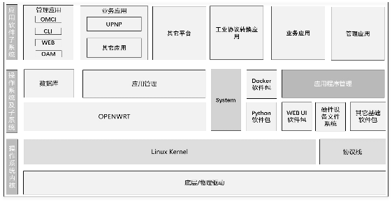 工業PON融合網關是中國電信自主研發的面向工業互聯網領域推出的一款功能強大、性能卓越的工業級終端產品,集本地管理、數據采集和通信于一體。具有開放式的軟硬件架構,硬件層面平臺化和模塊化,內置六核的處理器和較強算力的AI硬加速單元,提供豐富的物理接口;軟件層面采用開放式平臺架構,業務功能容器化和APP 化,按照業務功能將軟件劃分為多個業務APP,實現快速迭代和部署,支持第三方工業應用的加載和運行,并通過容器技術,將業務軟件與操作系統隔離,提升系統的安全性。工業PON融合網關開放平臺的架構如下: