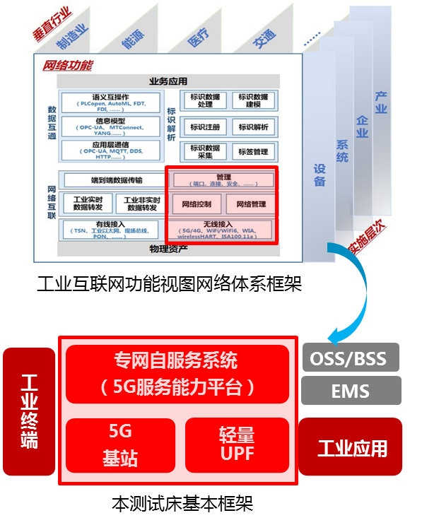 本測試床在工業(yè)互聯(lián)網(wǎng)功能視圖網(wǎng)絡(luò)體系框架中的位置如下圖所示,通過無線接入、網(wǎng)絡(luò)控制實(shí)現(xiàn)5G虛擬專網(wǎng),通過網(wǎng)絡(luò)管理、管理實(shí)現(xiàn)企業(yè)對(duì)專網(wǎng)的自主管理、自主開戶開卡。
