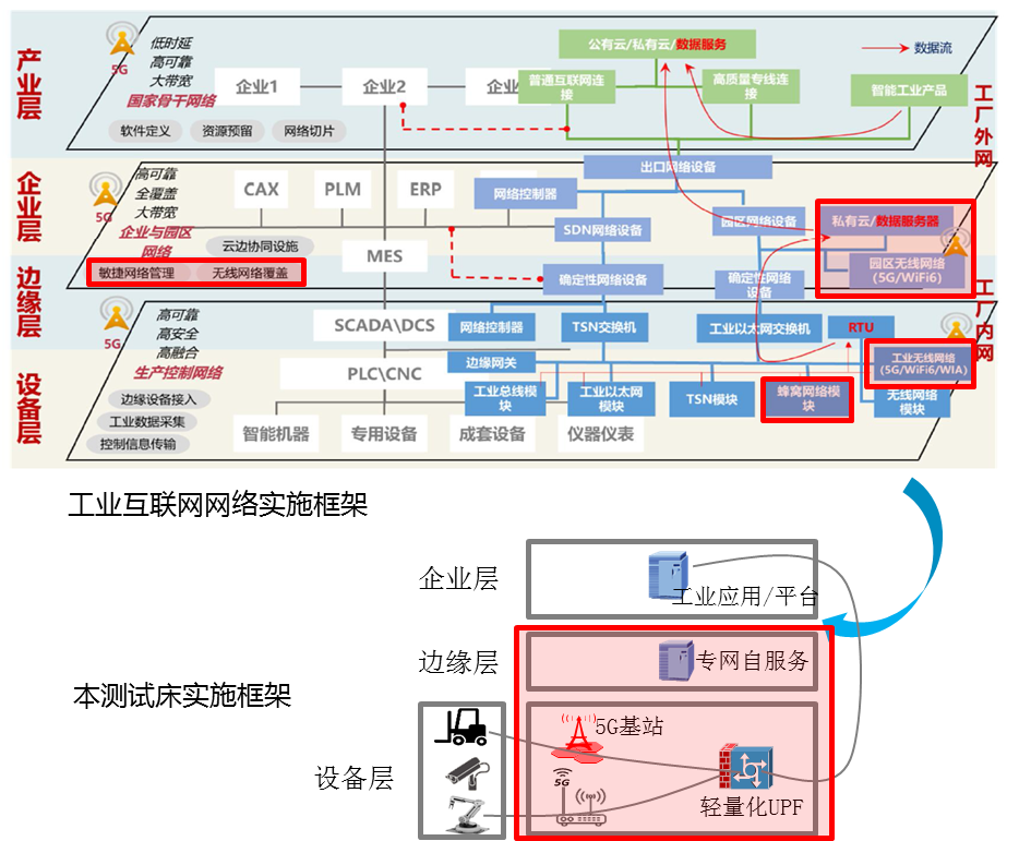 測試床適用于支撐智能工廠中的工業(yè)智能應(yīng)用場景的工廠專網(wǎng)、園區(qū)專網(wǎng)方案。