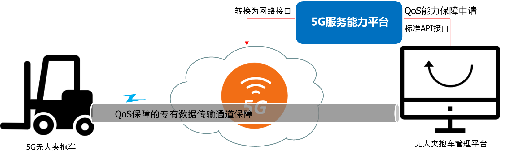 網(wǎng)絡(luò)實(shí)時(shí)響應(yīng)應(yīng)用需求:網(wǎng)絡(luò)實(shí)時(shí)建立QoS保障專屬通道,給夾抱車的5G連接進(jìn)行提速、保障,以確保叉車視頻數(shù)據(jù)、圖像數(shù)據(jù)的可靠傳輸?shù)狡脚_(tái)。