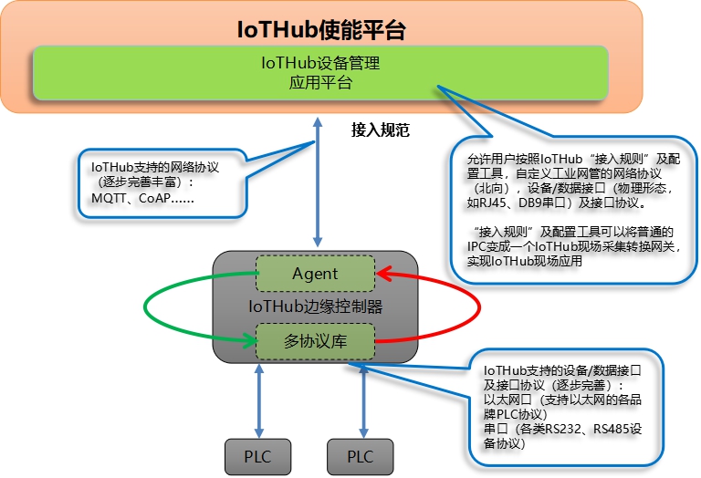 IoTHub邊緣控制器是IT和OT之間的物理接口,實現工業互聯網應用的南向與北向“互聯互通”。IoTHub邊緣控制器產品(圖3)包括IoTHub Agent邊緣采集網關、工控機等。結合不同的采集、處理及存儲需求,邊緣控制涵蓋ARM架構、X86架構的處理器,支持Linux及Windows操作系統,結合工業現場典型的數據接口類型,典型的南向物理接口包括RJ45(LAN)、RS232、RS485、GPIO等接口,支持主流的PLC協議及數控協議,用于連接邊緣層設備。北向提供RJ45(WAN)、4G、WiFi等網絡接口,支持標準TCP/IP、MQTT等網絡協議,用于連接工業互聯網平臺或工業互聯網賦能平臺(圖4),完成IT與OT的物理融合。