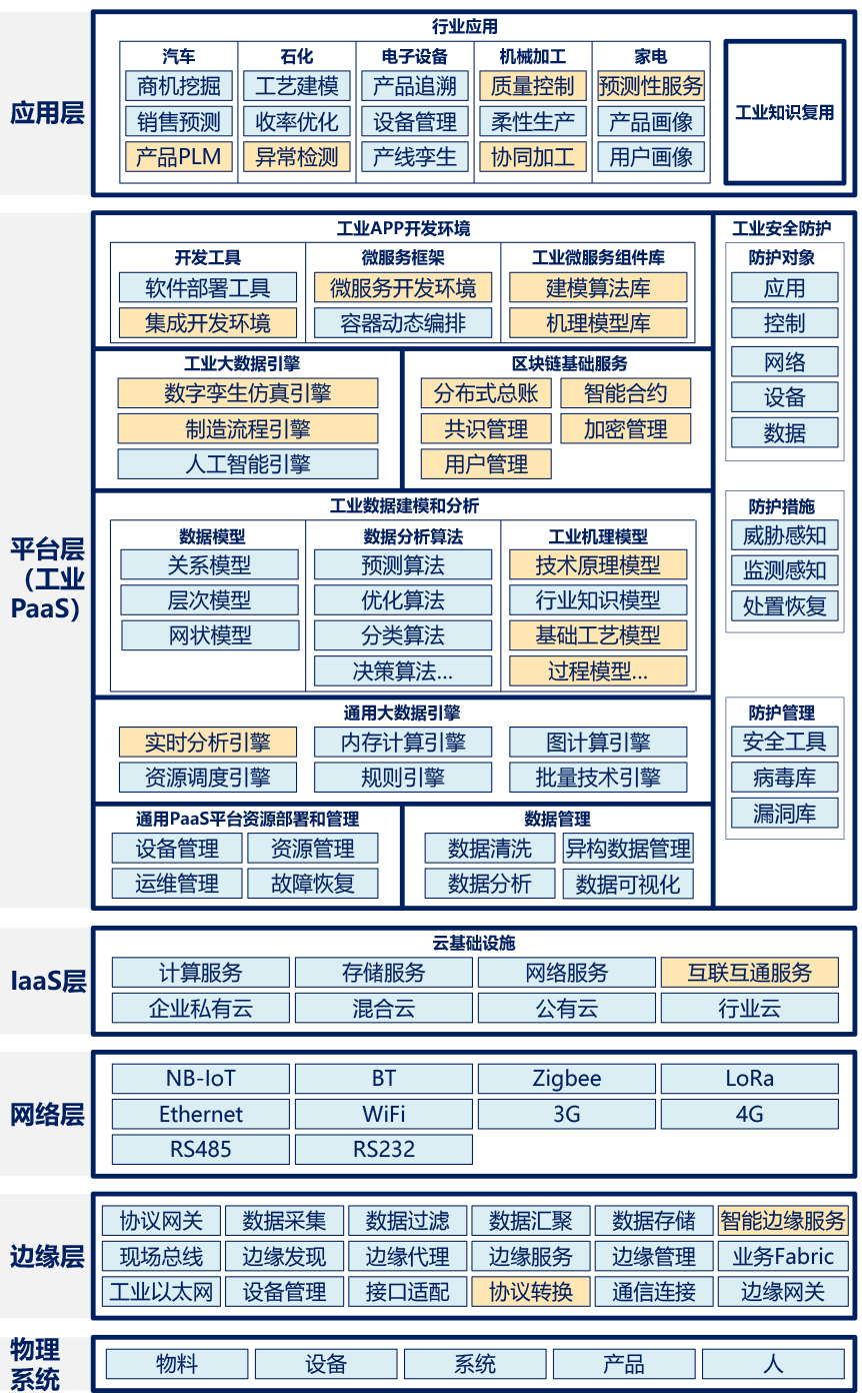 應(yīng)用層(工業(yè)SaaS層):提供從需求分析、產(chǎn)品研發(fā)、生產(chǎn)制造、過(guò)程控制、供應(yīng)鏈協(xié)同到營(yíng)銷(xiāo)服務(wù)的各類(lèi)工業(yè)APP及APP框架,涵蓋需求畫(huà)像、產(chǎn)品畫(huà)像、行為畫(huà)像、輔助設(shè)計(jì)、輔助分析、數(shù)據(jù)計(jì)算、協(xié)同仿真、工廠設(shè)計(jì)、資源計(jì)劃、流程仿真、物流管理、線(xiàn)上實(shí)訓(xùn)、過(guò)程監(jiān)測(cè)、運(yùn)行日志、設(shè)備運(yùn)維、過(guò)程優(yōu)化、過(guò)程控制、供應(yīng)鏈管理、企管財(cái)務(wù)、銷(xiāo)售管理、資產(chǎn)管理、運(yùn)營(yíng)決策、輿情分析、智能客服、質(zhì)量溯源、維修備件、遠(yuǎn)程服務(wù)等全價(jià)值鏈應(yīng)用。以及面向用戶(hù)的精準(zhǔn)營(yíng)銷(xiāo)、智慧研發(fā)、協(xié)同制造、智慧服務(wù)、智能供應(yīng)鏈等應(yīng)用,面向供應(yīng)商和開(kāi)發(fā)者的用戶(hù)運(yùn)營(yíng)、開(kāi)發(fā)者社區(qū)、產(chǎn)業(yè)聯(lián)盟協(xié)作門(mén)戶(hù)等的業(yè)務(wù)綜合應(yīng)用。