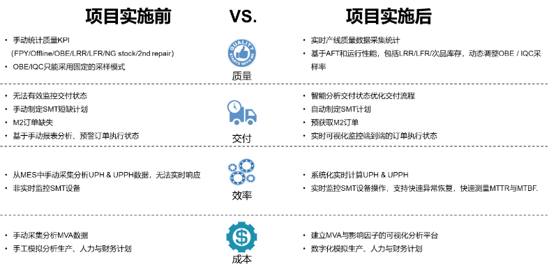 面向智能化生產(chǎn)的SMT產(chǎn)線(xiàn)優(yōu)化方案在聯(lián)想多個(gè)制造工廠、多條產(chǎn)線(xiàn)的實(shí)施,提升UPPH(單位人時(shí)產(chǎn)能)1.7%,產(chǎn)品FPY(一次通過(guò)率)0.54%,OTS(工程樣件)交付率5%,每年提升產(chǎn)線(xiàn)利潤(rùn)200萬(wàn)美金以上。