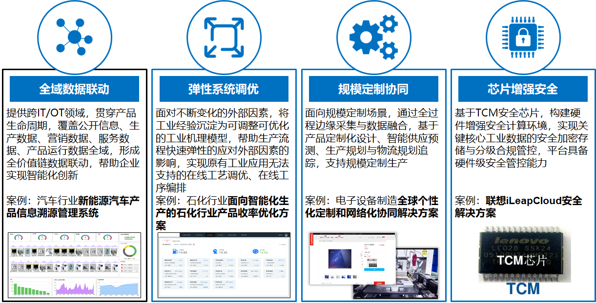 聯(lián)想工業(yè)互聯(lián)網(wǎng)平臺(tái)建設(shè)與時(shí)間以iLeapCloud工業(yè)互聯(lián)網(wǎng)平臺(tái)建設(shè)運(yùn)營(yíng)為基礎(chǔ),面向汽車(chē)、電子、石化、家電、機(jī)加行業(yè),研制跨平臺(tái)跨領(lǐng)域的產(chǎn)品及解決方案。通過(guò)建立和豐富平臺(tái)知識(shí)庫(kù)、用例庫(kù)、模型庫(kù),開(kāi)展垂直行業(yè)的多領(lǐng)域智能化賦能,進(jìn)一步豐富平臺(tái)功能完整性、可靠性、兼容性、安全性。通過(guò)對(duì)產(chǎn)品及解決方案的持續(xù)迭代和驗(yàn)證,豐富和完善平臺(tái)在邊緣計(jì)算與優(yōu)化、通用PaaS、工業(yè)數(shù)據(jù)建模分析、機(jī)理模型與微服務(wù)組件開(kāi)發(fā)應(yīng)用、APP開(kāi)發(fā)、平臺(tái)互聯(lián)互通和芯片級(jí)硬安全方面的能力,不斷豐富和完善平臺(tái)應(yīng)用生態(tài)。