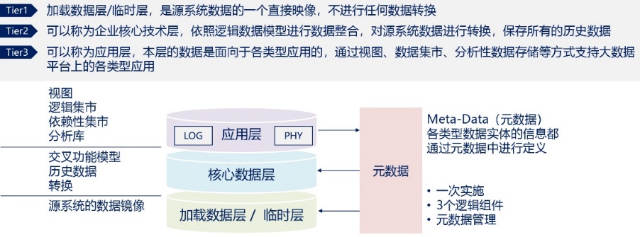 總體數(shù)據(jù)架構(gòu)分為加載數(shù)據(jù)層/臨時(shí)層、核心數(shù)據(jù)層、業(yè)務(wù)應(yīng)用層,如下圖所示,