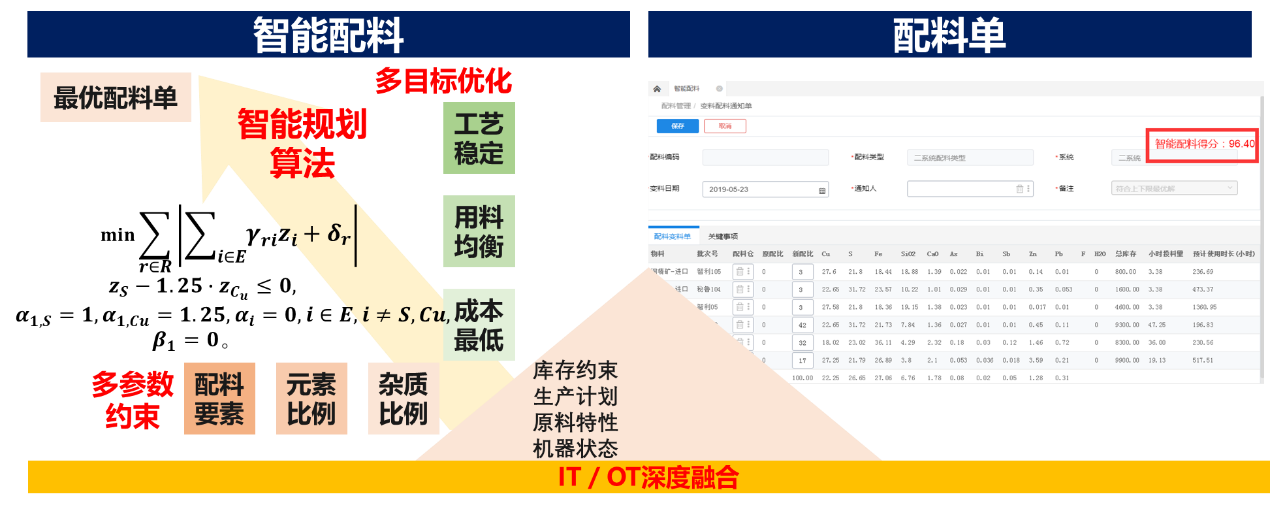 智能配料系統(tǒng)記錄配料相關(guān)的各種約束(約束條件在使用過程中進(jìn)行迭代優(yōu)化),動態(tài)調(diào)用最新原料的存量和元素含量,由智能算法進(jìn)行原料的投入配比規(guī)劃輸出。