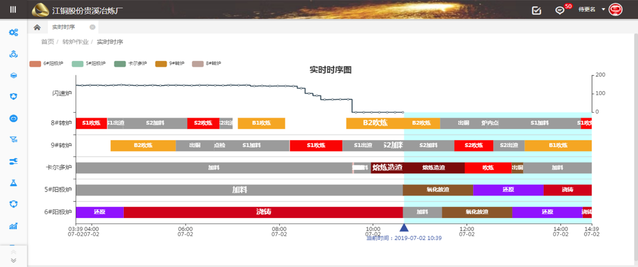 根據(jù)熔煉作業(yè)數(shù)據(jù)自動按熔爐組實時狀態(tài)形成節(jié)奏時序圖,提升整個熔煉系統(tǒng)調(diào)度指揮管理的智能化水平,以信息共享、過程可控、科學(xué)預(yù)判為重心,構(gòu)建閃速爐、轉(zhuǎn)爐、陽極爐的生產(chǎn)管控的智能化支撐,共享三大爐完整的作業(yè)進(jìn)度,及時、準(zhǔn)確調(diào)整作業(yè)要求,實現(xiàn)作業(yè)預(yù)期判斷和產(chǎn)品質(zhì)量最優(yōu)控制。