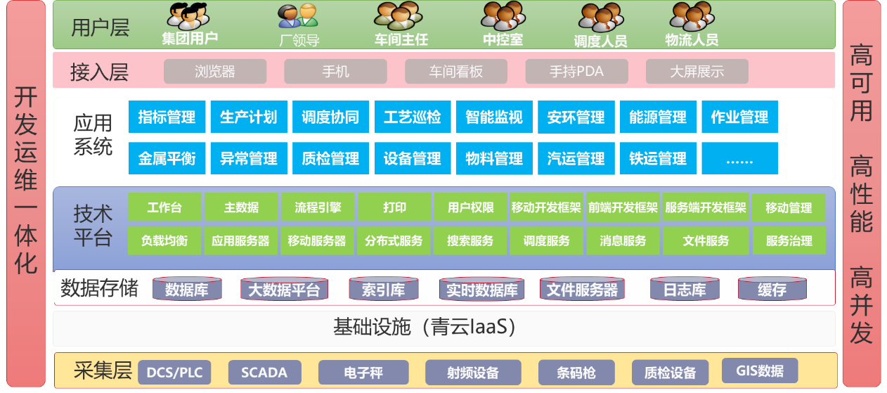應(yīng)用層:主要包括指標(biāo)管理、生產(chǎn)計劃、調(diào)度協(xié)同、工藝巡檢、智能監(jiān)視、安環(huán)管理、能源管理、作業(yè)管理、金屬平衡、異常管理、質(zhì)檢管理、設(shè)備管理、物料管理、汽運管理、鐵運管理等。
