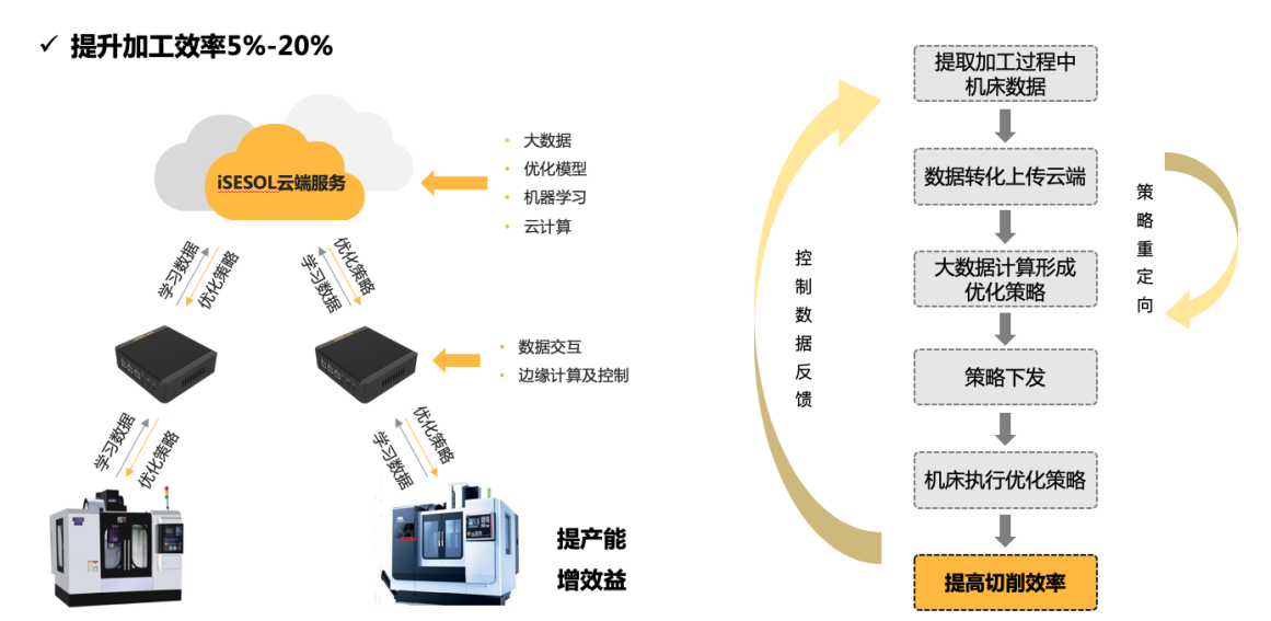 iSESOL 智能增效應(yīng)用在不改變原有機床加工程序的基礎(chǔ)上,通過智能化的算法識別與學習,生成基于該工況下唯一的優(yōu)化策略,通過該策略指導后續(xù)加工過程,對機床進行智能化調(diào)控,能夠提升機床加工效率平均達10%以上。通過預(yù)設(shè)的人機交互界面,終端用戶可以對設(shè)備運行的多種環(huán)境因素進行錄入,同時再結(jié)合實時的數(shù)據(jù)采集、學習和控制結(jié)果反饋,對優(yōu)化策略不斷進行歸集和調(diào)整。