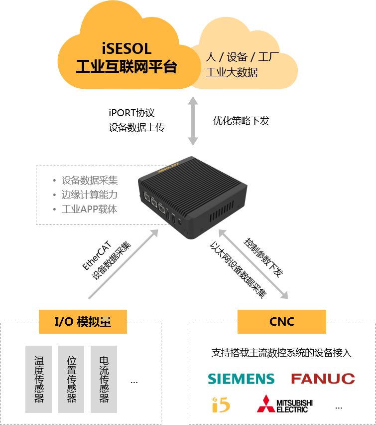 iSESOL BOX(“智能魔盒”)邊緣網(wǎng)關(guān)由智能云科自主研發(fā),具備工業(yè)現(xiàn)場設(shè)備運行數(shù)據(jù)及環(huán)境數(shù)據(jù)的采集、邊緣計算以及邊云協(xié)同等技術(shù)特點,為機加工企業(yè)的設(shè)備狀態(tài)監(jiān)控、生產(chǎn)效率提升及設(shè)備全生命周期運維等應(yīng)用場景提供技術(shù)支撐。