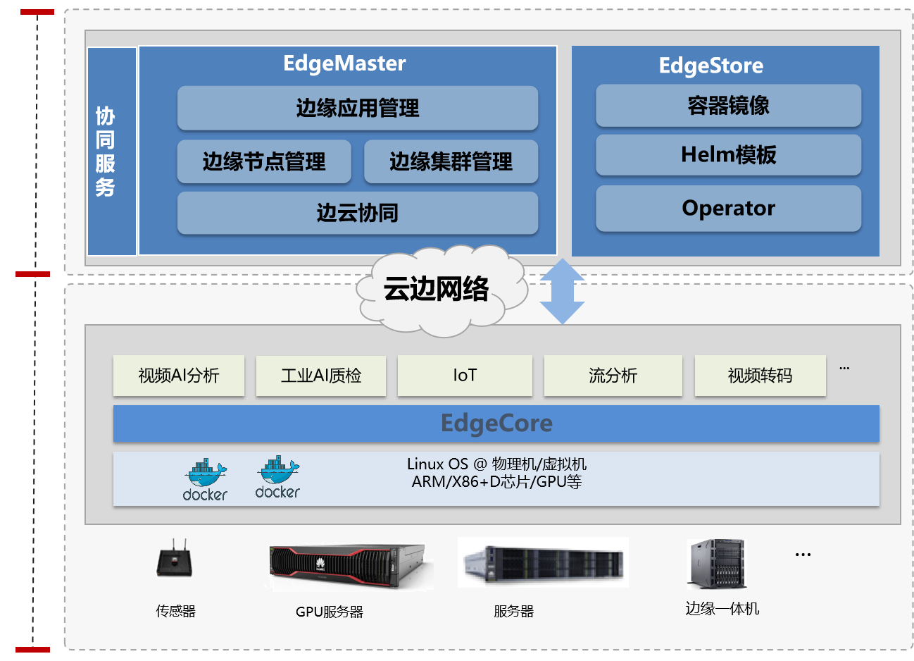 為實現陸地對海上遠程管理降低運維成本、提高管理效率,應用云邊協同技術實現接入的海量邊緣節點進行遠程配置,將模型和服務批量下發到邊緣節點,管理和調度容器資源使其高可用,實現服務協同、數據協同、網絡協同、應用協同的全生命周期管理。