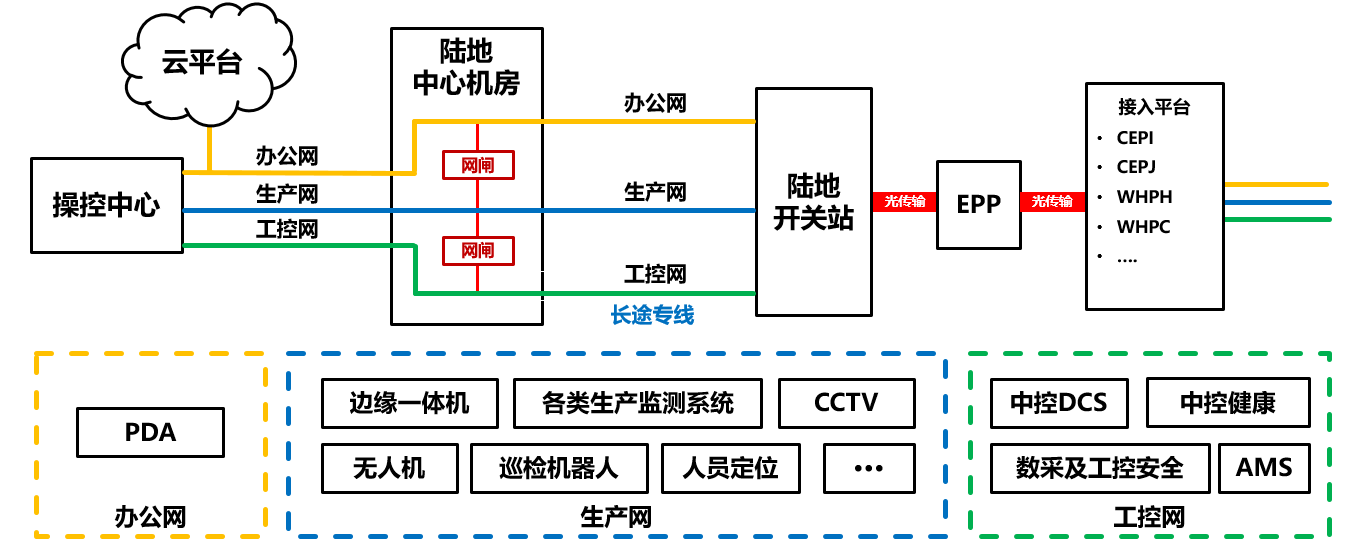 (1)利用海底光纜搭建海上油田群光纖環路,并通過陸地省際專線接入企業信息中心,為海量數據入湖和云邊高效協同構建高安全、高可靠、低時延的信息高速公路。