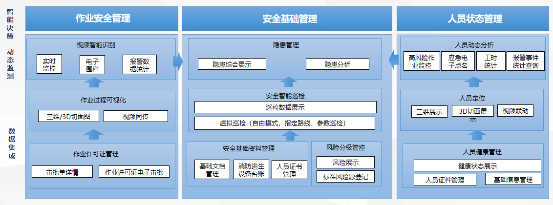 將自主研發的國產化三維數字可視化引擎與人員定位技術深度融合,實時獲取人員健康數據和位置信息,應用AI視頻智能識別技術,實現作業現場人的不安全行為、物的不安全狀態、環境風險及管理上漏洞10種場景的實時監測,提前預警風險,防范事故發生。針對業務特性構建云端應用業務架構,具體架構圖如下: