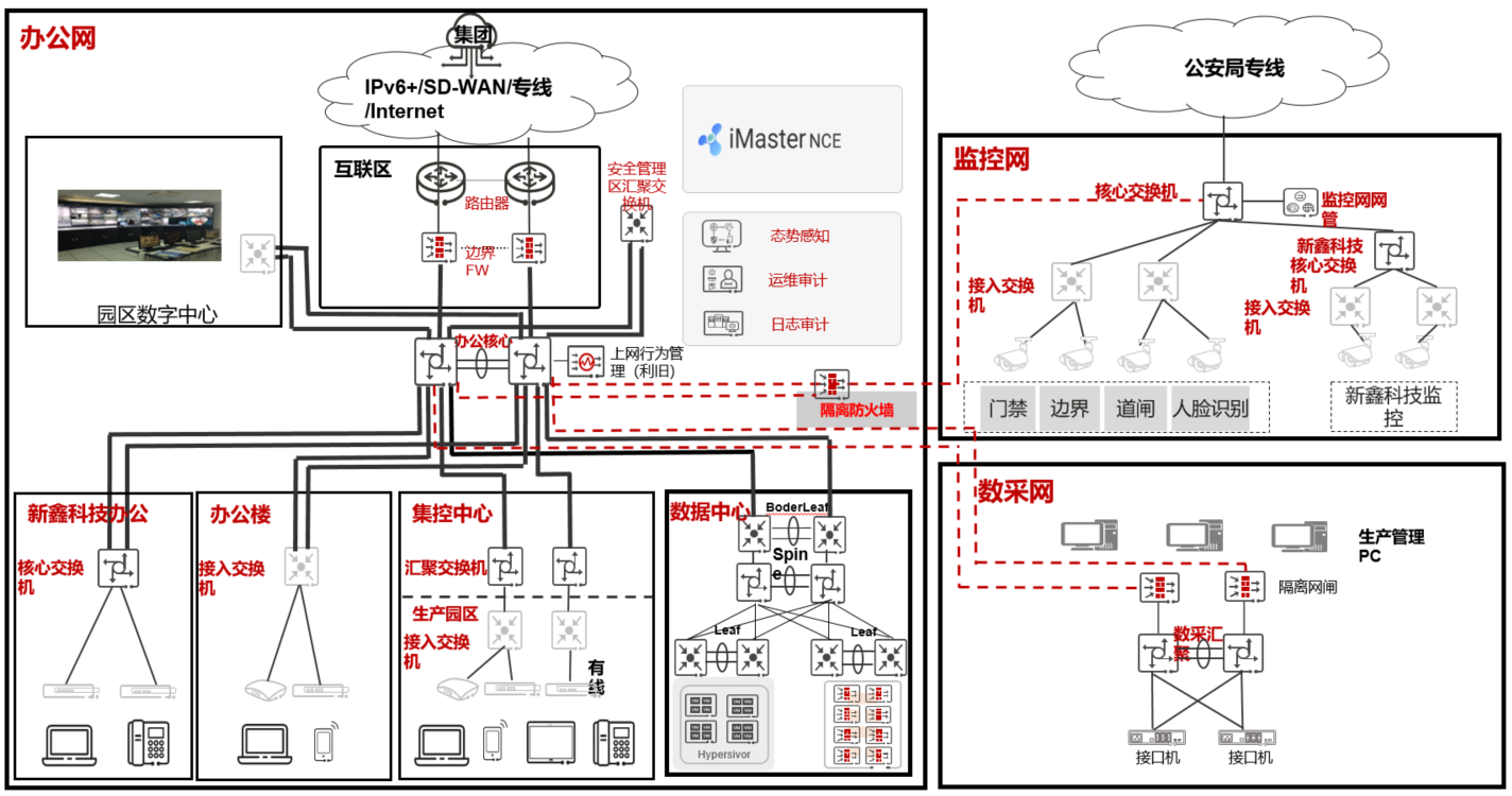 視頻監(jiān)控網(wǎng)、數(shù)采網(wǎng)通過網(wǎng)閘/防火墻接入辦公網(wǎng)絡(luò)。