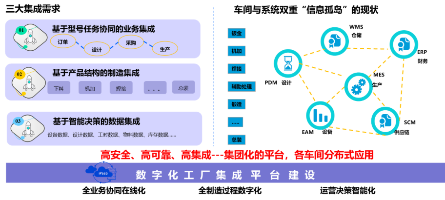 因為航天裝備制造行業(yè)的特殊性,同時還具有高安全、高可靠、高集成的要求;但是,現(xiàn)狀卻面臨著車間與系統(tǒng)的“雙重信息孤島”;集成平臺建設(shè)需求與“雙重信息孤島”是系統(tǒng)建設(shè)要解決的根本問題。