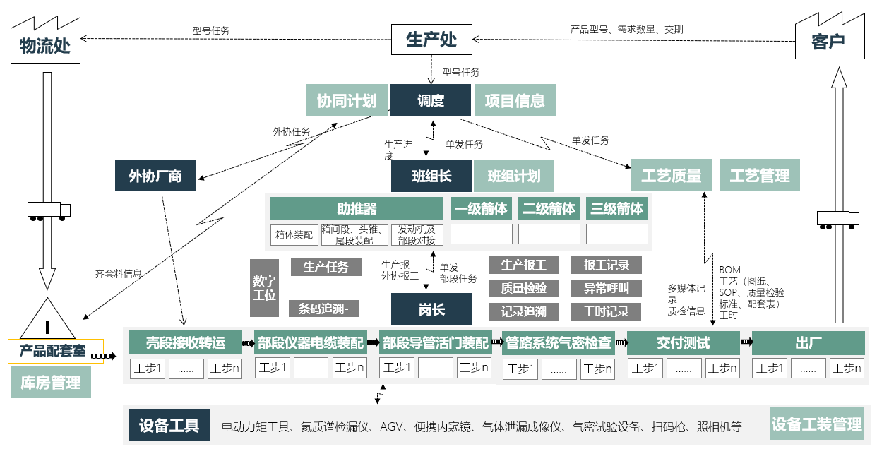 以數(shù)字化工廠平臺為基礎(chǔ),以總裝為起點,向機加、輔助處理、部裝等制程輻射,實現(xiàn)航天裝備制造全業(yè)務(wù)流程、全價值鏈的數(shù)字化協(xié)同。