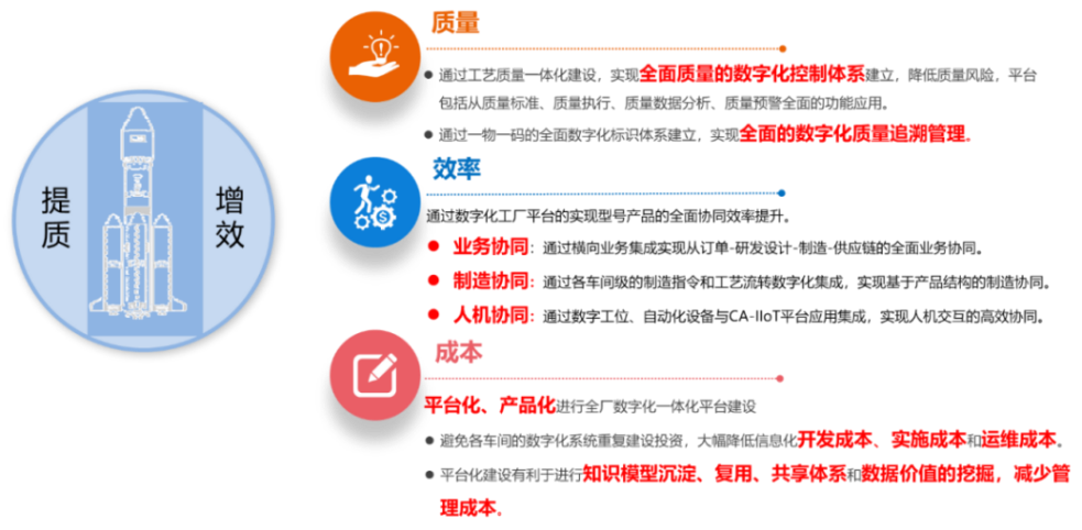 以航天裝備數(shù)字化為標(biāo)桿,為高端裝備制造企業(yè)打造工具化、低成本、一站式的數(shù)字化升級產(chǎn)品生態(tài);打造裝備制造產(chǎn)業(yè)數(shù)據(jù)獲取、數(shù)據(jù)匯聚、數(shù)據(jù)賦能的工業(yè)大數(shù)據(jù)應(yīng)用創(chuàng)新平臺;形成裝備制造業(yè)智能化升級、服務(wù)化轉(zhuǎn)型、創(chuàng)新性設(shè)計的新一代信息技術(shù)創(chuàng)新應(yīng)用共享服務(wù)平臺,助力我國裝備制造業(yè)技術(shù)融合與產(chǎn)業(yè)升級。