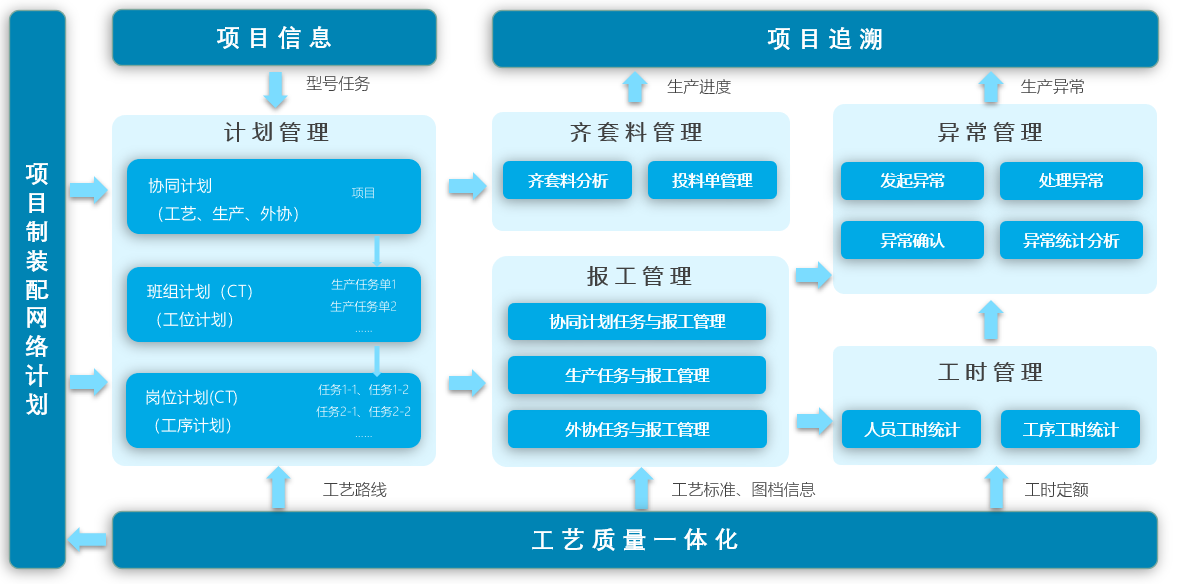 以單發(fā)產(chǎn)品的生產(chǎn)作為項目,通過單發(fā)總裝過程模型為網(wǎng)絡(luò)計劃控制主線,并貫穿于項目管理的整個過程;基于物料一物一碼的標(biāo)識編碼原則,從項目的立項開始到項目結(jié)束的全過程,其工藝文件發(fā)布、物料齊配套、設(shè)備工裝配套、生產(chǎn)進程等方面實現(xiàn)項目的全方位管理,使單發(fā)產(chǎn)品在總裝過程中信息化、透明化,可視化,從而實現(xiàn)總裝生產(chǎn)的脈動式和單元式的靈活切換,達到進度可控、風(fēng)險提前預(yù)警的管理要求,真正做到存在即可追溯。