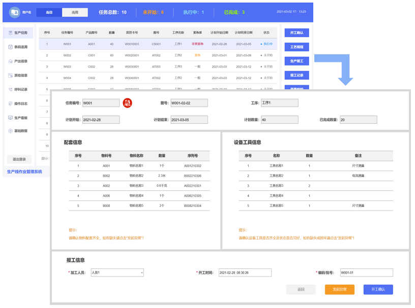 集成工藝管理平臺和制造運營管理系統(tǒng)信息,通過在各生產(chǎn)單元一體機終端建立數(shù)字工位(HMI),作為生產(chǎn)管控平臺在現(xiàn)場的執(zhí)行抓手,包含生產(chǎn)準(zhǔn)備、生產(chǎn)報工、質(zhì)量檢驗、異常處理等現(xiàn)場執(zhí)行操作業(yè)務(wù)模塊。