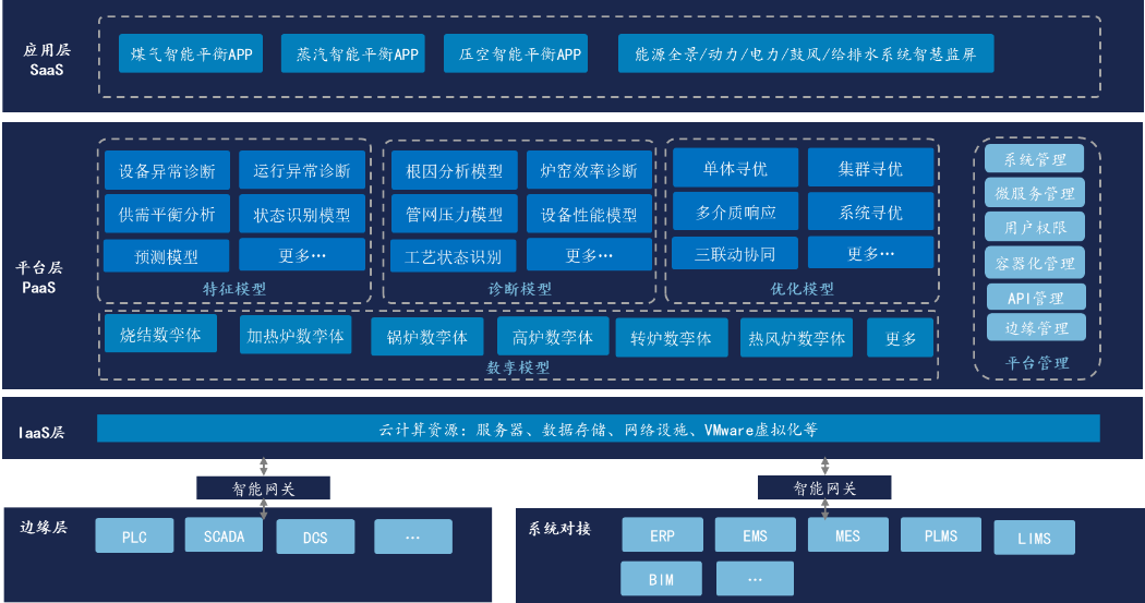 因此,本案例項目根據該鋼鐵企業能源系統平衡調度業務運營現狀,通過搭建鋼鐵行業工業互聯網平臺,建設企業最急需的煤氣、蒸汽和壓縮空氣的智能調度系統,并實現對基礎的能源數據進行梳理和監控,為下一步拓展工業互聯網應用建立夯實的基礎。