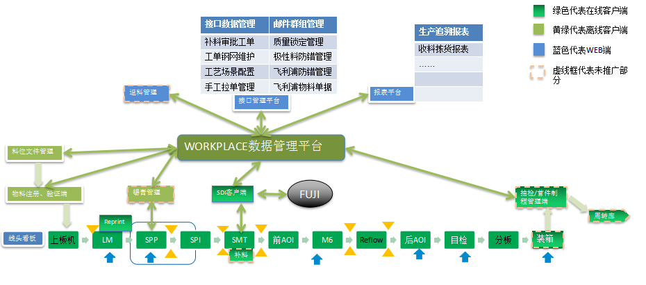 關(guān)鍵工位的采集數(shù)據(jù)都與板號關(guān)聯(lián),基于設(shè)備實時聯(lián)機實現(xiàn)產(chǎn)品在制工序全程閉環(huán)制程控制、高精度的單板物料追溯、SPI/AOI檢測信息追溯、實現(xiàn)(印刷機、前后AOI、SPI和整SMT段)良率、直通率的統(tǒng)計管理,工位的作業(yè)數(shù)據(jù)、生產(chǎn)報警、故障報警等等。