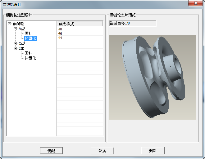 目前錨鏈輪共有A、C、E三種類型,其他種類可擴展。錨鏈輪的設計界面如下:
