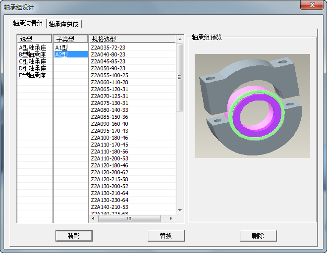 對選擇進行了篩選,主要包括:型號、材料、等級以及尺寸;在“型號”里選擇需要的緊固件國標號,在“材料”中選擇需要的材料,在“等級”中選擇需要的等級,在“尺寸”中選擇需要的尺寸;篩選結束后,在右側的對話框中選擇需要的規格;點擊“裝配”,可同時選擇多個坐標系對象進行批量裝配;如需要替換,可在篩選好之后,點擊“替換”,可同時選擇多個模型對象進行批量裝配替換。