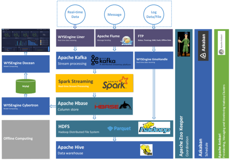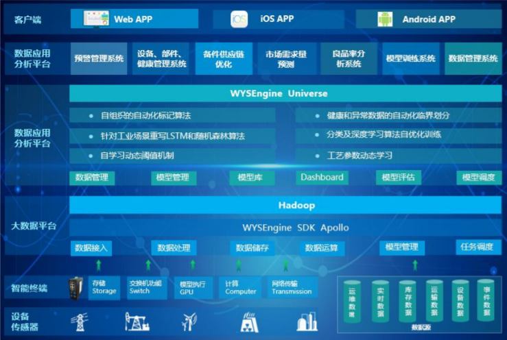 智能終端做為智擎工業設備數據采集運算終端,可以與設備PLC 通信,把傳感器的實時數據,錄波數據采集出來,并且作為端的運算終端,針對實時的數據進行初步的運算,然后進行大數據平臺的數據接入,可以支持數據的斷點續傳。WYSEngine SDK Apollo 作為產品數據接口的 SDK 組件,運行與 Hadoop 大數據平臺執行,按照工業設備的數據應用場景進行功能組件的封裝,實現從數據的接入、數據處理、數據存儲、數據運算、模型管理和任務調度等功能,為上層應用提供平臺級的支撐。