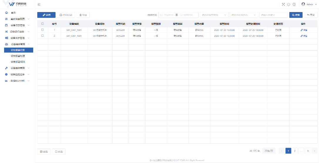 設(shè)備報警管理用來處理、記錄并管理設(shè)備的報警情況,通過系統(tǒng)定義設(shè)備的報警級別、報警規(guī)則、將數(shù)據(jù)采集裝置采集到的設(shè)備報警信息準確記錄到系統(tǒng)中,設(shè)備管理人員根據(jù)設(shè)備的報警情況采取有效的處理手段保障設(shè)備的正常運行,從而實現(xiàn)對設(shè)備的高效利用,是設(shè)備管理系統(tǒng)的核心功能。具體功能包含設(shè)備報警規(guī)則、設(shè)備報警記錄、設(shè)備報警處理。