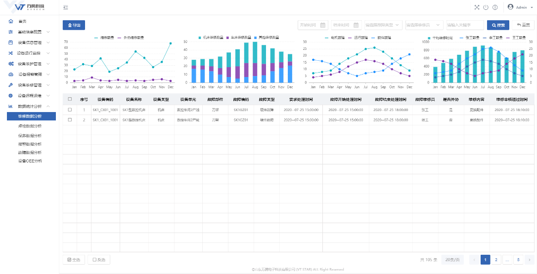數(shù)據(jù)統(tǒng)計分析用來對設(shè)備管理過程中產(chǎn)生的各項數(shù)據(jù)進行統(tǒng)計分析,幫助設(shè)備管理人員綜合了解設(shè)備整體情況,更有效地減少設(shè)備事故的發(fā)生,保持、提高設(shè)備的性能、精度,降低維修費用,提高企業(yè)的生產(chǎn)能力和經(jīng)濟效益,是設(shè)備管理系統(tǒng)的核心功能。具體功能包含維修數(shù)據(jù)統(tǒng)計分析、點檢數(shù)據(jù)統(tǒng)計分析、保養(yǎng)數(shù)據(jù)統(tǒng)計分析、報警數(shù)據(jù)統(tǒng)計分析、故障數(shù)據(jù)統(tǒng)計分析、設(shè)備OEE數(shù)據(jù)分析。