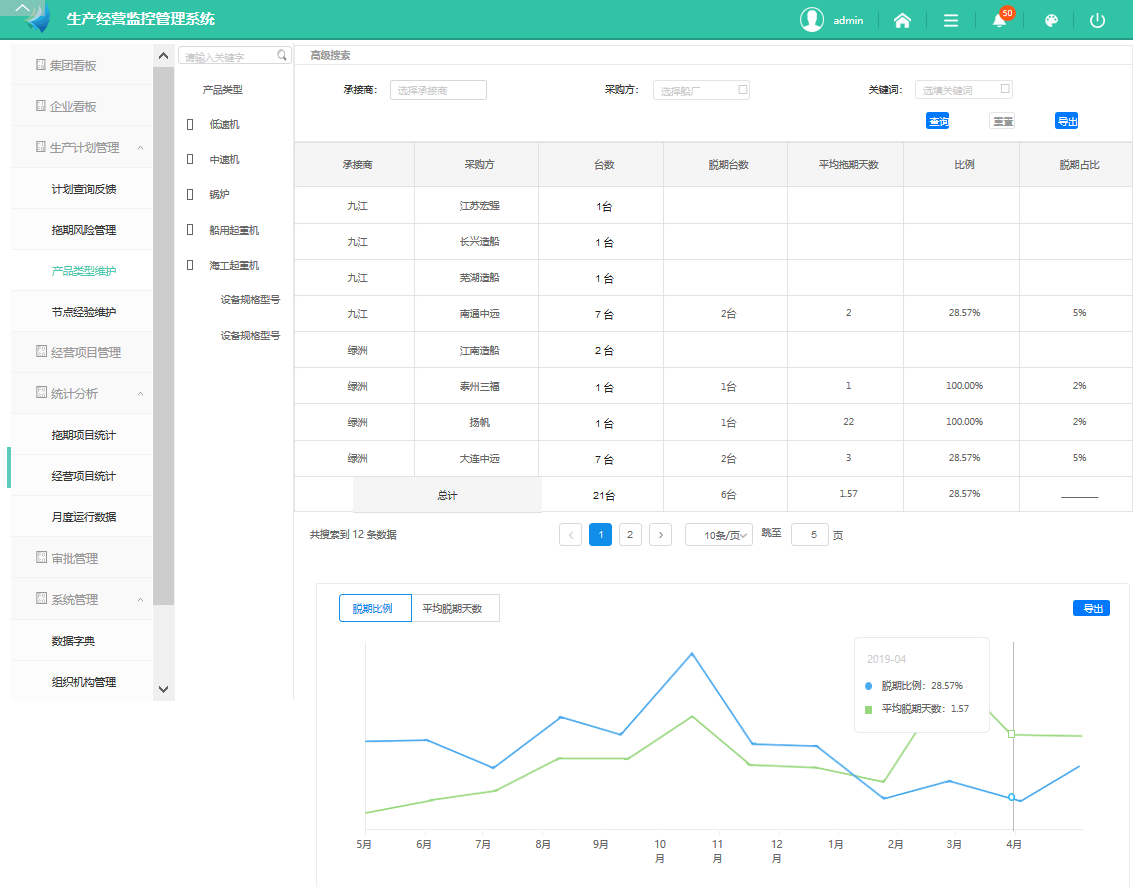 脫期項(xiàng)目統(tǒng)計(jì)主要基于產(chǎn)品類型、配套企業(yè)、采購(gòu)方以及關(guān)鍵詞等,對(duì)脫期項(xiàng)目進(jìn)行篩選統(tǒng)計(jì),呈現(xiàn)脫期臺(tái)數(shù)、脫期天數(shù)、脫期比例、脫期占比等統(tǒng)計(jì)表格,并形成趨勢(shì)圖。拖期項(xiàng)目統(tǒng)計(jì)功能示意如下圖所示: