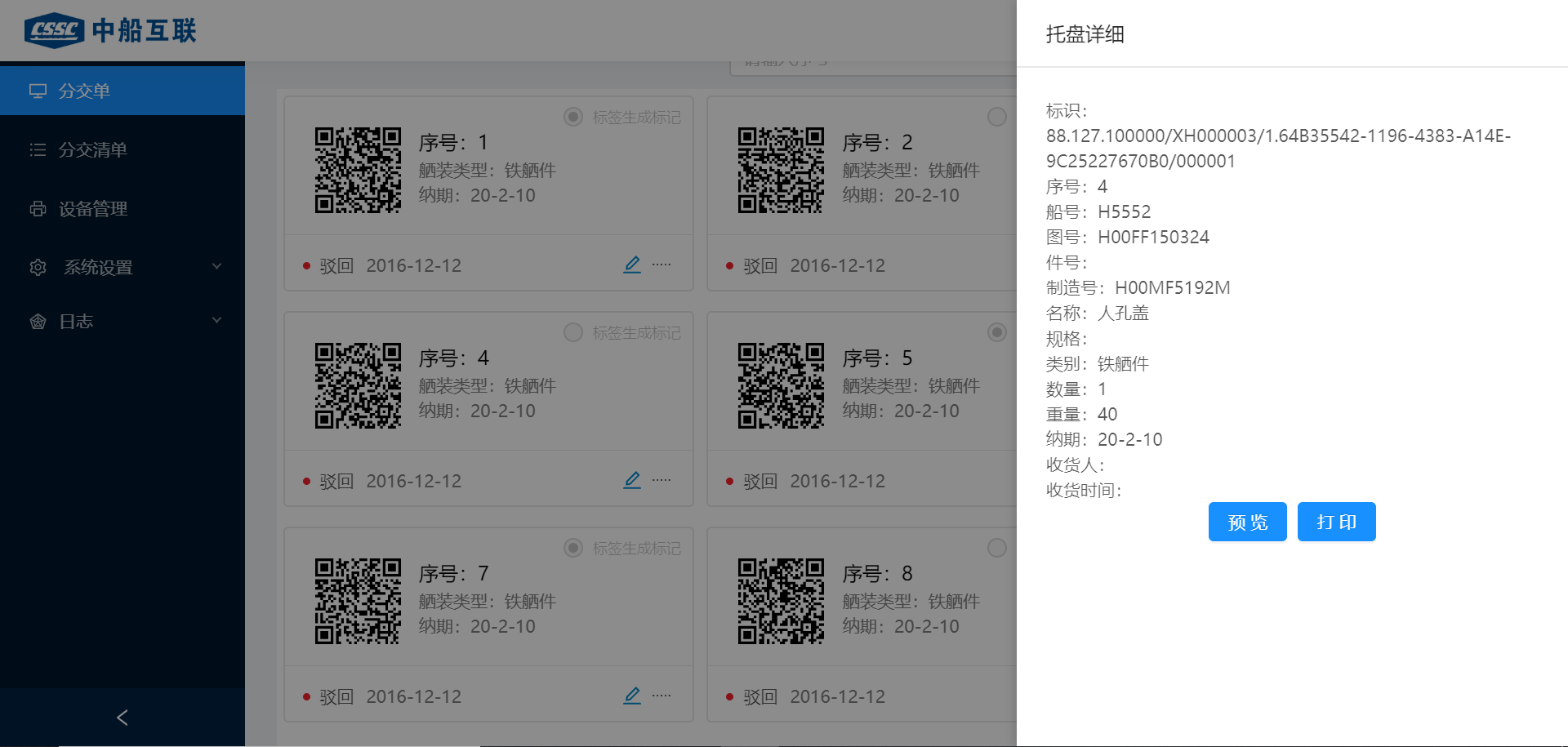 非標(biāo)件成品賦碼模塊結(jié)合工業(yè)互聯(lián)網(wǎng)標(biāo)識(shí)解析二級(jí)節(jié)點(diǎn),獲取在制非標(biāo)件編碼、屬性、圖紙等信息,并且通過(guò)與打印機(jī)、掃描設(shè)備等賦碼和標(biāo)識(shí)識(shí)別設(shè)備集成,實(shí)現(xiàn)標(biāo)識(shí)的快速打印,同時(shí)通過(guò)打印信息與生產(chǎn)制造信息的集成,實(shí)現(xiàn)配套企業(yè)生產(chǎn)制造狀態(tài)的實(shí)時(shí)在線反饋。其系統(tǒng)界面如下圖所示: