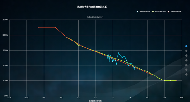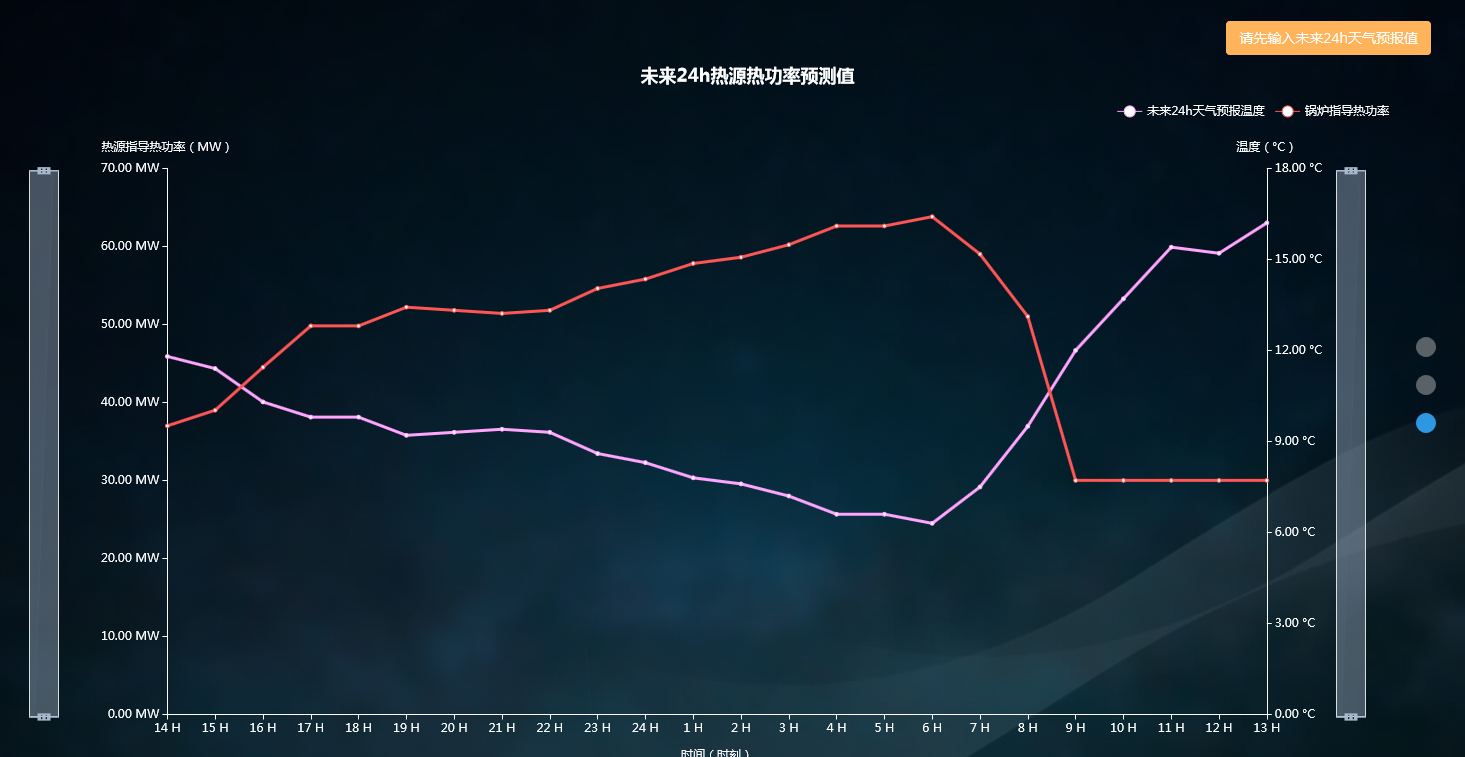 基于大量歷史數據,得出一次網供熱溫度在不同工況下的純延遲與慣性時間?;跓嵩礄C理與數據驅動,建立精確的熱源預測模型,通過該模型得出熱源在室外溫度改變時,預測的熱源功率優化曲線。進而保證合理的供熱量,保證換熱站的熱量供給,如下圖所示。