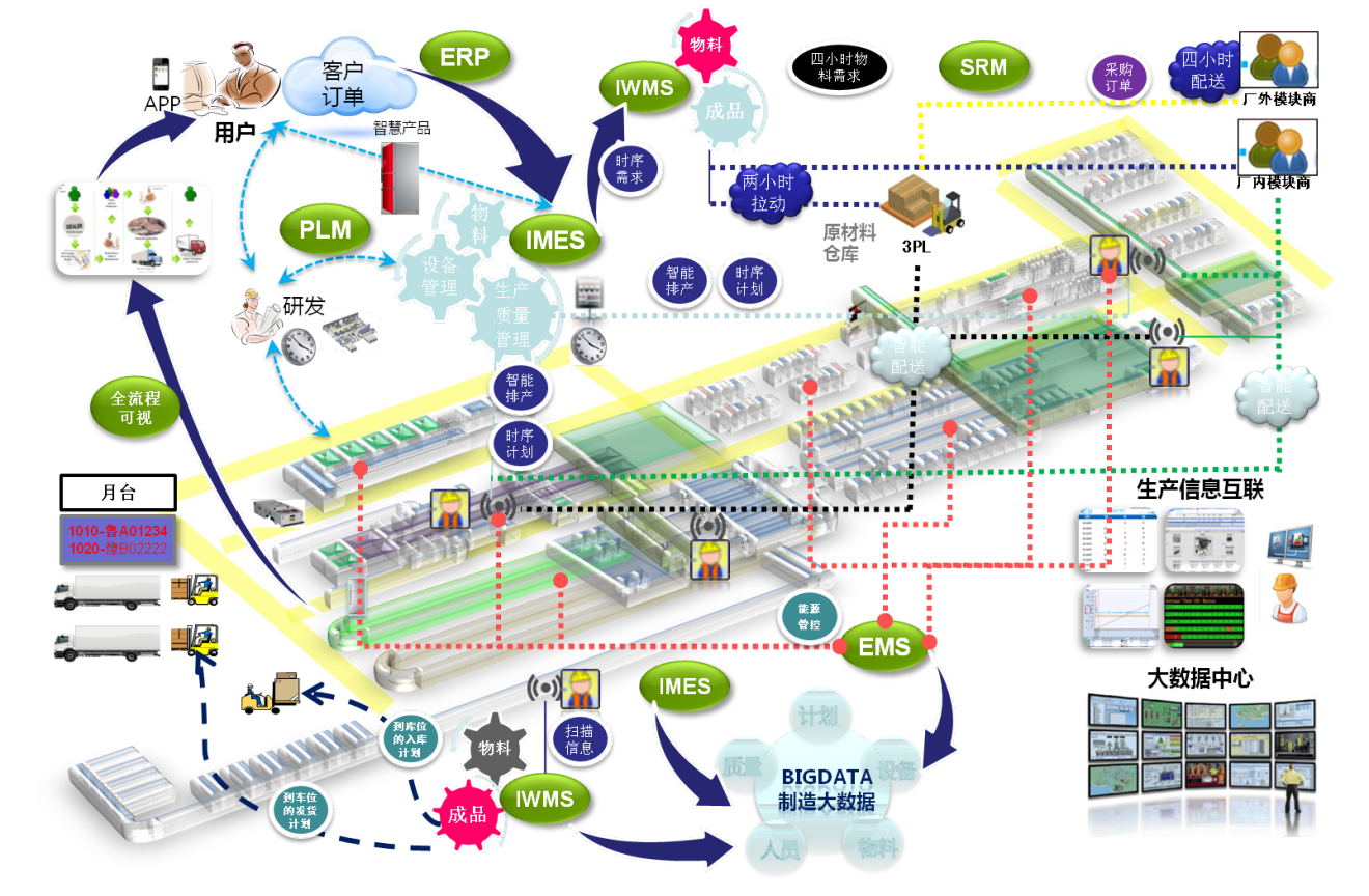 沈陽(yáng)冰箱智能互聯(lián)工廠架構(gòu)的核心是智能制造執(zhí)行 iMES 系統(tǒng),通過(guò)iMES驅(qū)動(dòng)ERP、Logitics、PLM(包含CAD/CAPP/設(shè)計(jì)仿真、制造仿真)、Control(生產(chǎn)數(shù)據(jù)采集分析等)五大系統(tǒng)集成;業(yè)務(wù)上通過(guò)智能的制造,把制造、研發(fā)、物流緊密的互聯(lián)互通。通過(guò)智能制造執(zhí)行系統(tǒng)和現(xiàn)場(chǎng)智能化硬件的連接,構(gòu)建了一個(gè)高度靈活的個(gè)性化和數(shù)字化制造模式,逐步實(shí)現(xiàn)從管理、研發(fā)、生產(chǎn)、物流的數(shù)字化管理,提升企業(yè)全系統(tǒng)、全業(yè)務(wù)的智能化水平。