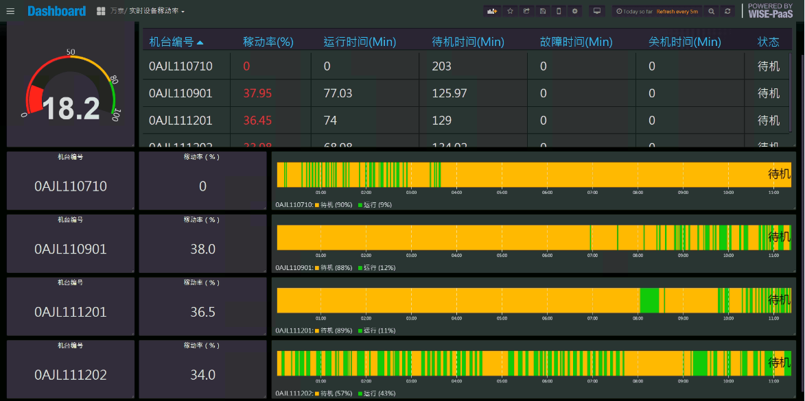以物聯網技術監控設備實時狀態等資訊,通過研華先進的WISE-PaaS智能工廠物聯網平臺服務架構,結合標桿化KPI管理看板和后臺數據分析,找到數據可視化方法,實現對機床生產狀態、主軸溫度、負載、刀具信息等基礎數據進行采集,對NC程序代碼進行上傳和下載。通過可視化數據,進行設備綜合效率OEE的評估、機床報警信息統計分析、磨齒檢測和了解在制品WIP的分布。通過一目了然的了解所有機床狀態實時,及時調整生產計劃,提高稼動率。