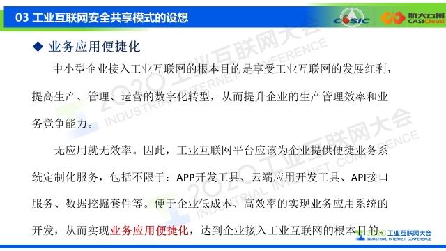 點(diǎn)擊以下鏈接查看演講視頻: 專家說 “中小企業(yè)接入工業(yè)互聯(lián)網(wǎng)的根本目的是享受工業(yè)互聯(lián)網(wǎng)的發(fā)展紅利,實(shí)現(xiàn)生產(chǎn)、管理、運(yùn)營(yíng)的數(shù)字化轉(zhuǎn)型,從而提升企業(yè)的生產(chǎn)管理效率和業(yè)務(wù)競(jìng)爭(zhēng)能力。無(wú)應(yīng)用就無(wú)效率,因此工業(yè)互聯(lián)網(wǎng)平臺(tái)應(yīng)該為企業(yè)提供便捷業(yè)務(wù)定制化服務(wù),包括不限于APP的開發(fā)工具、云端應(yīng)用開發(fā)工具、API服務(wù)接口、數(shù)據(jù)挖掘套件等,便于企業(yè)低成本、高效率實(shí)現(xiàn)業(yè)務(wù)應(yīng)用系統(tǒng)的開發(fā),從而實(shí)現(xiàn)業(yè)務(wù)應(yīng)用便捷化,達(dá)到企業(yè)接入工業(yè)互聯(lián)網(wǎng)的根本目的。” 以下是演講PPT 敬請(qǐng)閱讀