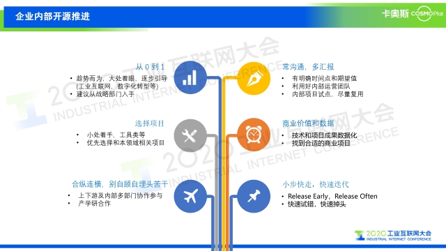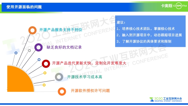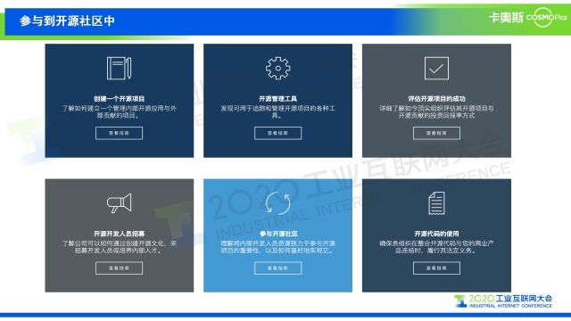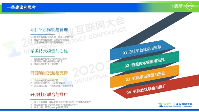 點擊下方鏈接,觀看演講視頻 專家說 “給大家一些在開源領(lǐng)域?qū)用娴慕ㄗh和思考。第一,項目平臺實現(xiàn)賦能與管理,要提供開源項目代碼托管、備份、交流的工具,通過一些工具來完善并且促進(jìn)我們開源項目的管理。第二,輔助開源項目管理,要定期關(guān)注運營報告,同時要制定社區(qū)和整個項目的管理規(guī)則。第三,發(fā)起開源項目,支持開源項目,要從制定標(biāo)準(zhǔn)、開發(fā)工具,一致性認(rèn)證、性能測評等等方面來推進(jìn)。最后,開源社區(qū)的聯(lián)合與推廣,要做到產(chǎn)學(xué)研各個層面的聯(lián)合。開源不僅僅是源碼的開源,更重要的是我們要做到生態(tài)的建設(shè)。只有這樣,才能實現(xiàn)開源的真正推廣與落地。 以下是演講PPT 敬請閱讀