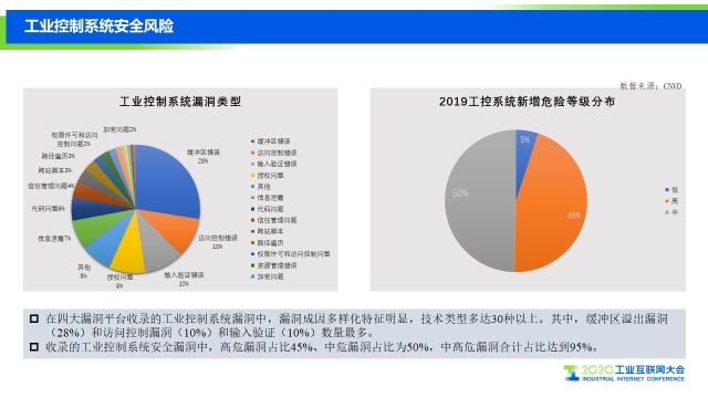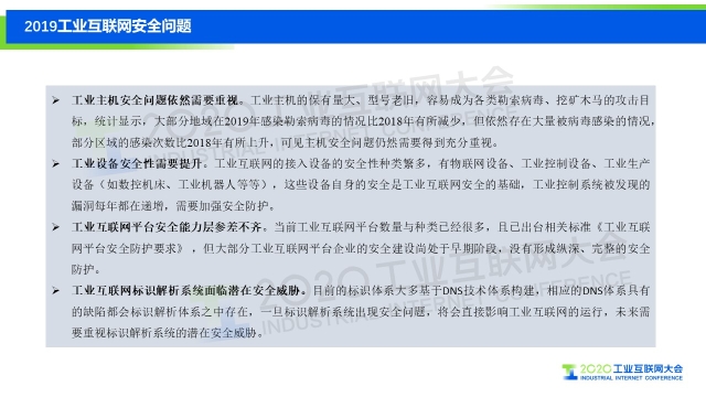 “2019年工業互聯網安全問題主要是四個方面:第一,由于工業主機系統陳舊,工業主機的安全性依然需要重視;第二,工業設備安全性需要提升,包括工業控制系統、物聯網系統、數控機床等,要防范利用工業漏洞的針對性攻擊;第三,工業互聯網平臺安全能力參差不齊,雖說已經發布了相關的平臺安全標準,但大部分工業互聯網平臺企業安全建設尚處于初期,沒有形成完整的縱深的安全防護;第四,由于新技術的應用,比如標識解析系統、5G技術的大量應用,未來可能會有大規模的安全風險,要提前做好安全防范。”