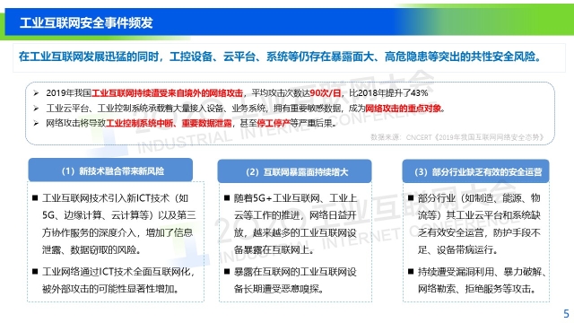 “工業互聯網安全事件頻發,主要是因為工業互聯網在發展迅猛的同時,工控設備、云平臺、系統仍然存在著暴露面大、高危隱患突出的共性安全風險。據統計,我國工業互聯網持續遭受來自境外的網絡攻擊,這些攻擊會導致工業控制系統中斷、重要的數據泄露,甚至停工停產等嚴重后果。經分析,這些安全風險主要來自三個方面,一是工業網絡與新的ICT技術融合所帶來的風險;二是互聯網暴露面持續增大所帶來的風險;三是部分行業工業網絡缺乏有效的安全運營。因此,工業互聯網的安全防護任重而道遠。”