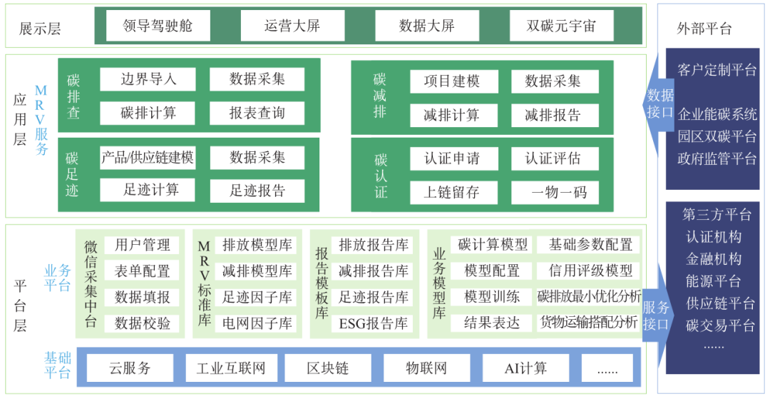 平臺(tái)層包含基礎(chǔ)平臺(tái)層與業(yè)務(wù)平臺(tái)層。基礎(chǔ)平臺(tái)層提供了云服務(wù)、物聯(lián)網(wǎng)、區(qū)塊鏈、大數(shù)據(jù)、人工智能(Artificial Intelligence,AI)計(jì)算等底層基礎(chǔ)功能;業(yè)務(wù)平臺(tái)層集成了數(shù)據(jù)采集中臺(tái)、核算標(biāo)準(zhǔn)庫(kù)、報(bào)告模板庫(kù)、業(yè)務(wù)模型庫(kù)等業(yè)務(wù)數(shù)據(jù)。應(yīng)用層提供碳盤查、碳足跡、碳減排以及碳認(rèn)證4個(gè)大功能模塊,為企業(yè)提供標(biāo)準(zhǔn)監(jiān)測(cè)、報(bào)告及核查流程。展示層借助元宇宙、數(shù)字孿生等能力搭建領(lǐng)導(dǎo)駕駛艙、元宇宙空間,便于數(shù)據(jù)實(shí)時(shí)呈現(xiàn)。