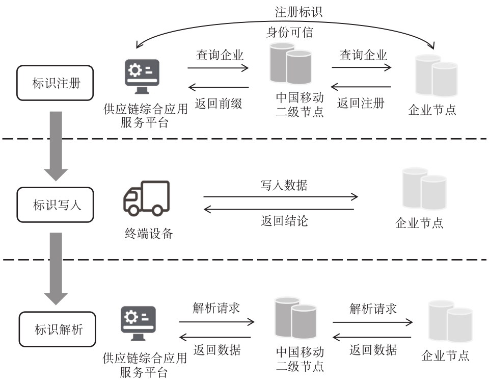 為實(shí)現(xiàn)對(duì)電力、燃?xì)狻⑿旭偫锍痰然顒?dòng)數(shù)據(jù)的可信采集,保證數(shù)字身份、個(gè)人資產(chǎn)和設(shè)備信息的隱私安全,本文以雙碳綠色供應(yīng)鏈為應(yīng)用場(chǎng)景,基于工業(yè)互聯(lián)網(wǎng)標(biāo)識(shí)解析體系,將工業(yè)互聯(lián)網(wǎng)主動(dòng)標(biāo)識(shí)創(chuàng)新技術(shù)引入到雙碳綠色供應(yīng)鏈數(shù)據(jù)采集服務(wù)中。通過(guò)主動(dòng)標(biāo)識(shí)解析技術(shù),打通供應(yīng)鏈環(huán)節(jié)中多主體系統(tǒng)間的信息傳輸壁壘(見圖1),主要業(yè)務(wù)流程包括以下3方面。