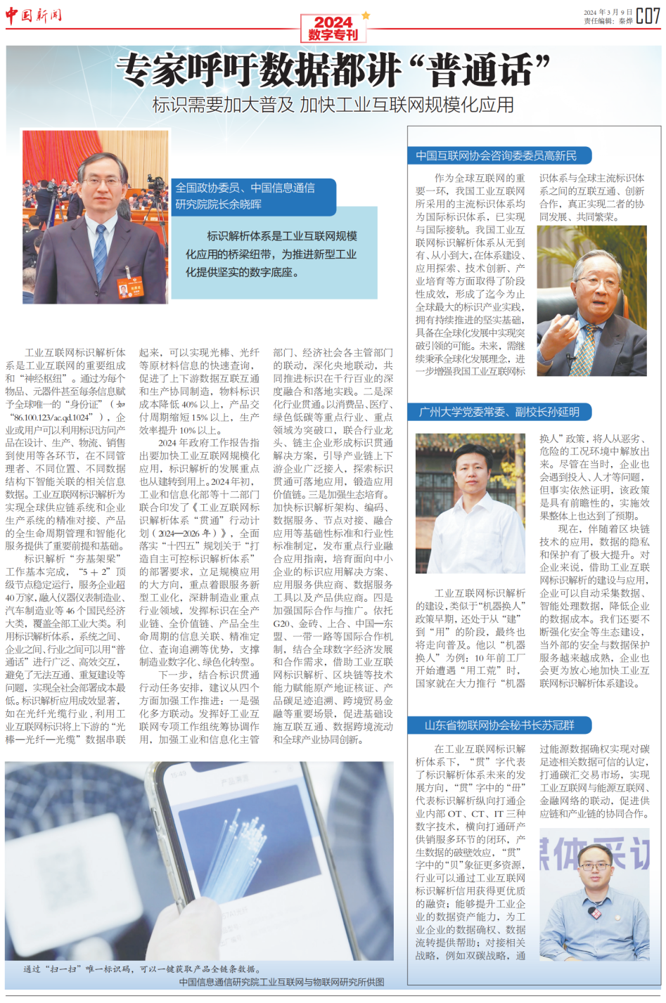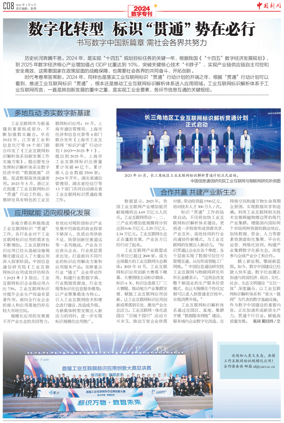 3月9日,《中國新聞》報推出全國兩會數字專刊,從工業互聯網標識的蓬勃發展看“我們離數字中國還有多遠”。報道指出“如今,數字中國建設已經駛入快車道,以工業互聯網標識解析體系和“星火·鏈網”為代表的數字基礎設施,作為數字中國建設的重要內容,正在加速形成新質生產力,貫通千行百業,賦能高質量發展。”標識“貫通”勢在必行,規模化應用的發展離不開產業生態的共同努力。