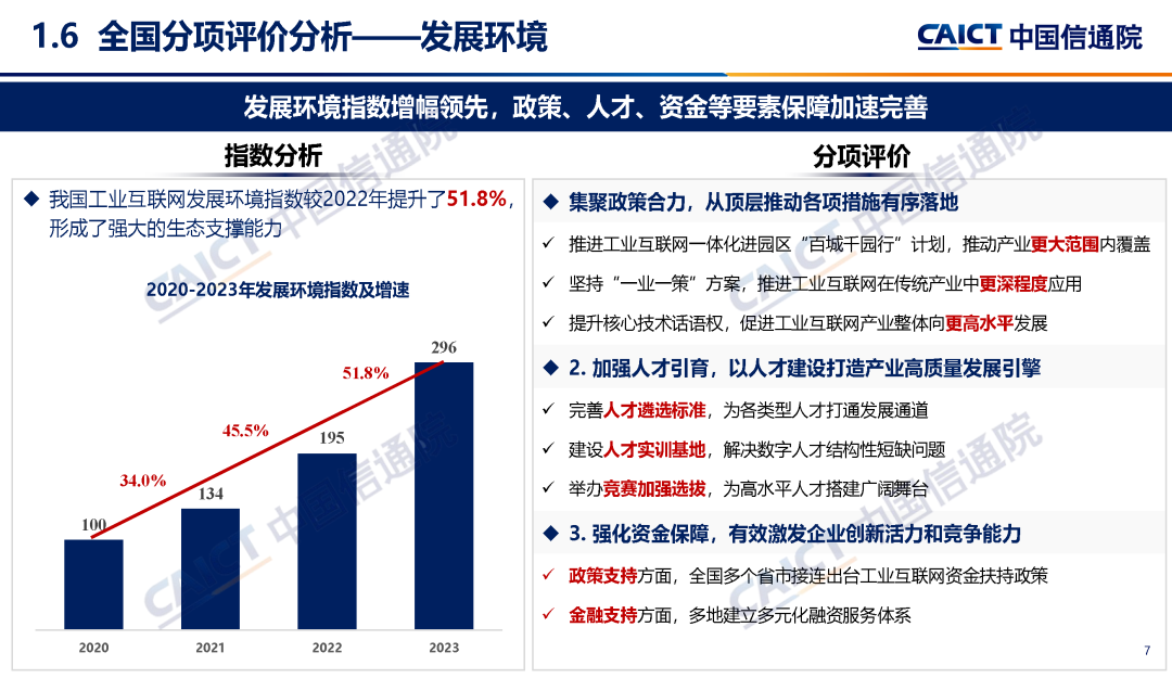 1. 全國工業(yè)互聯(lián)網(wǎng)發(fā)展成效指數(shù)顯示,我國工業(yè)互聯(lián)網(wǎng)進入全面推進的快速增長期。基礎能力指數(shù)連續(xù)三年高速增長,從“規(guī)模擴張”向“質(zhì)量提升、結(jié)構(gòu)優(yōu)化、功能升級”轉(zhuǎn)變;技術創(chuàng)新指數(shù)穩(wěn)步提升,新領域創(chuàng)新突破助力“換道超車”;產(chǎn)業(yè)發(fā)展指數(shù)增長提速,產(chǎn)業(yè)從舊到新、從小到大、從弱到強邁進;應用推廣指數(shù)穩(wěn)定增長,由“全面探索”轉(zhuǎn)向“場景推廣、鏈式轉(zhuǎn)型”;發(fā)展環(huán)境指數(shù)增幅領先,政策、人才、資金等要素保障加速完善。