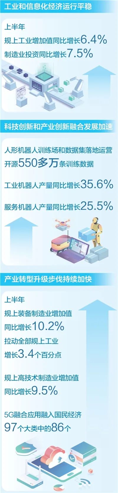 截至上半年,規上輕工業企業數字化研發工具普及率達86.2%;5G融合應用融入國民經濟97個大類中的86個,建設超過1.85萬個“5G+工業互聯網”項目……工業和信息化部信息通信發展司司長謝存介紹,上半年,傳統產業轉型升級步伐扎實,加快實現高質量發展。