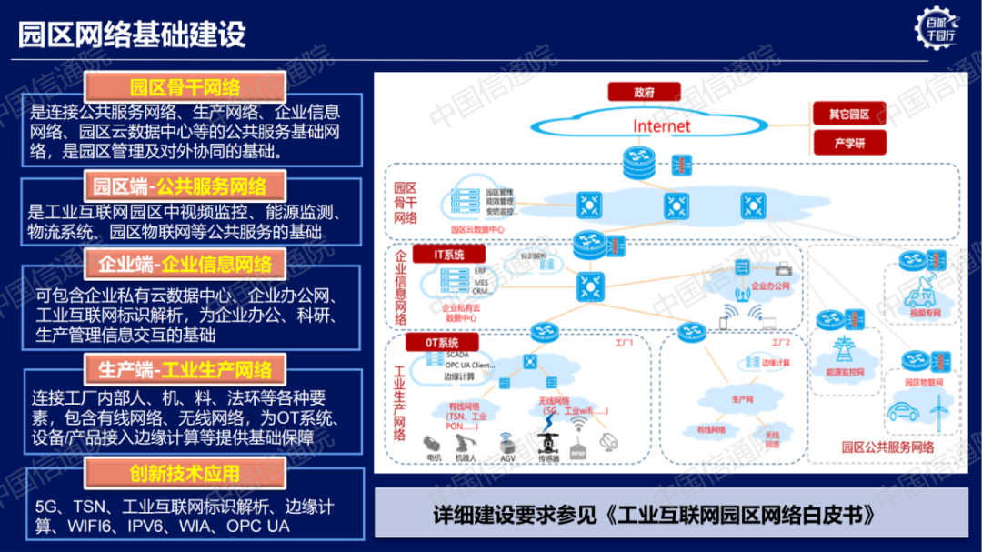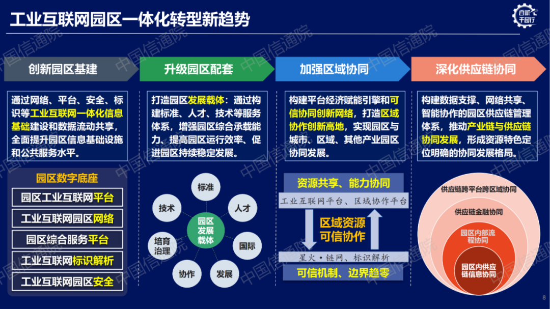 工業互聯網園區是以高質量發展為目標,按照工業互聯網內涵要求,規劃、建設、運營、提升的新型園區。園區應緊密圍繞我國建設現代化經濟體系這一戰略目標,以協同創新、集群集約、虛實融合、綠色低碳、安全生產為導向,通過網絡、標識、平臺、安全體系和新模式、新業態的構建,來指導新園區建設和存量園區轉型發展。