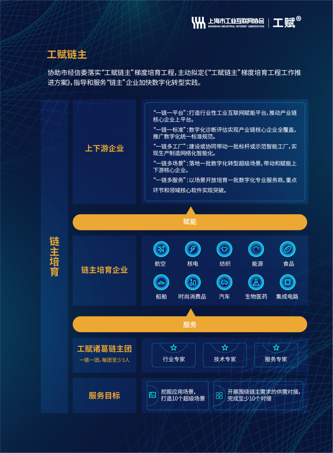 根據《上海市制造業數字化轉型實施方案》,到2025年上海將培育40家“工賦鏈主”,會上開展“工賦鏈主”建圈強鏈結對儀式,通過“工賦鏈主”,集中帶動電力、紡織、船舶及汽車等4個行業鏈上企業尤其是中小企業低成本、高效率地進行數字化轉型。在“一鏈一平臺”和“一鏈一標準”的基礎上,還要打造“一鏈多工廠”“一鏈多場景”和“一鏈多服務”,形成極具特點的推進制造業數字化轉型的“上海模式”。