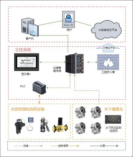 本方案包含四個部分:礬花視頻采集系統(tǒng)(功能:視頻信號采集、傳輸機(jī)器視覺等)、邊緣智能終端系統(tǒng)(功能:圖像灰度處理、投加量動態(tài)計(jì)算等)、自動加藥系統(tǒng)(功能:自動加藥控制等)、廠級云平臺管理系統(tǒng)(功能:廠級監(jiān)控中心等)。