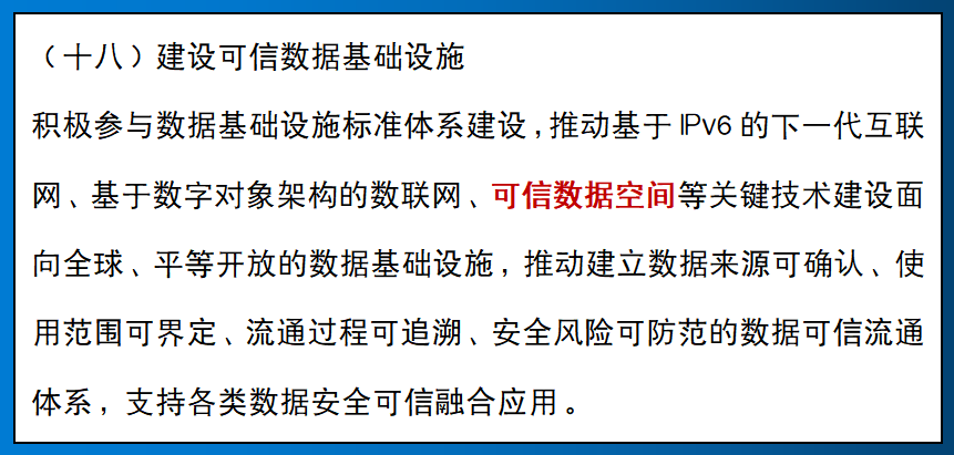 為貫徹落實(shí)黨中央、國務(wù)院關(guān)于構(gòu)建數(shù)據(jù)基礎(chǔ)制度更好發(fā)揮數(shù)據(jù)要素作用的決策部署,深入實(shí)施《北京市數(shù)字經(jīng)濟(jì)促進(jìn)條例》,北京市發(fā)布《關(guān)于更好發(fā)揮數(shù)據(jù)要素作用進(jìn)一步加快發(fā)展數(shù)字經(jīng)濟(jì)的實(shí)施意見》(以下簡稱《實(shí)施意見》),明確:推動(dòng)基于IPv6的下一代互聯(lián)網(wǎng)、基于數(shù)字對(duì)象架構(gòu)的數(shù)聯(lián)網(wǎng)、可信數(shù)據(jù)空間等關(guān)鍵技術(shù)建設(shè)面向全球、平等開放的數(shù)據(jù)基礎(chǔ)設(shè)施。
