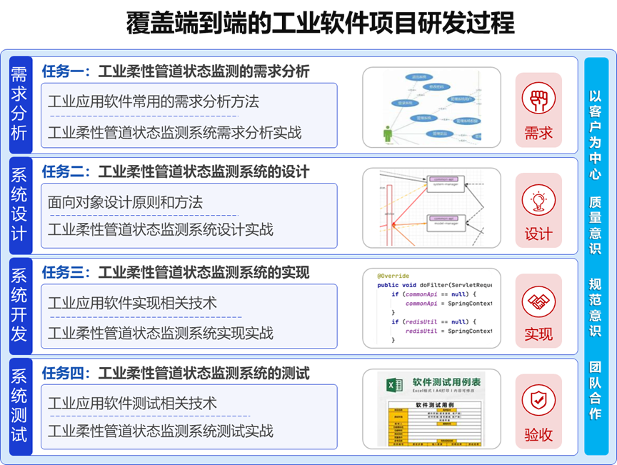 本實訓主要讓學生通過一個工業互聯網APP的開發,實踐項目開發的全過程。此實訓的設計嚴格按照企業的項目開發流程,讓學生全程參與,在掌握工業互聯網APP開發技能的同時,結合實際的應用場景理解“人機料法環”等工業互聯網的核心要素,熟悉工業互聯網軟件工程的全過程。在實訓過程中,學生不僅可以了解軟件項目過程中需要學習的知識,需要設置的崗位角色以及各個崗位角色之間如何配合,更需要充分發揮學生的主觀能動性,基礎好的帶動基礎弱的,共同進步,互相促進,體現團隊的優勢,懂得團隊合作能發揮最大效能。