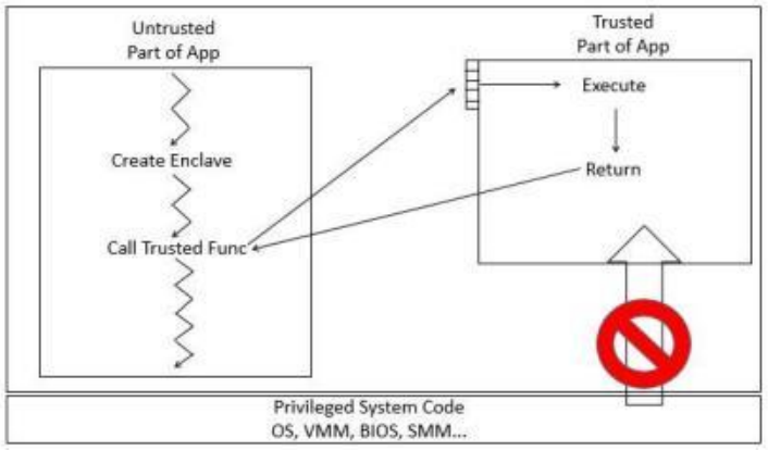 SGX允許用戶態(tài)及內(nèi)核態(tài)代碼定義將特定內(nèi)存區(qū)域,設(shè)置為私有區(qū)域,此區(qū)域也被稱為飛地(Enclave)。其內(nèi)容受到保護(hù),不能被本身以外的任何進(jìn)程存取,包括高權(quán)限級別運行的進(jìn)程(例如操作系統(tǒng)內(nèi)核進(jìn)程)。
